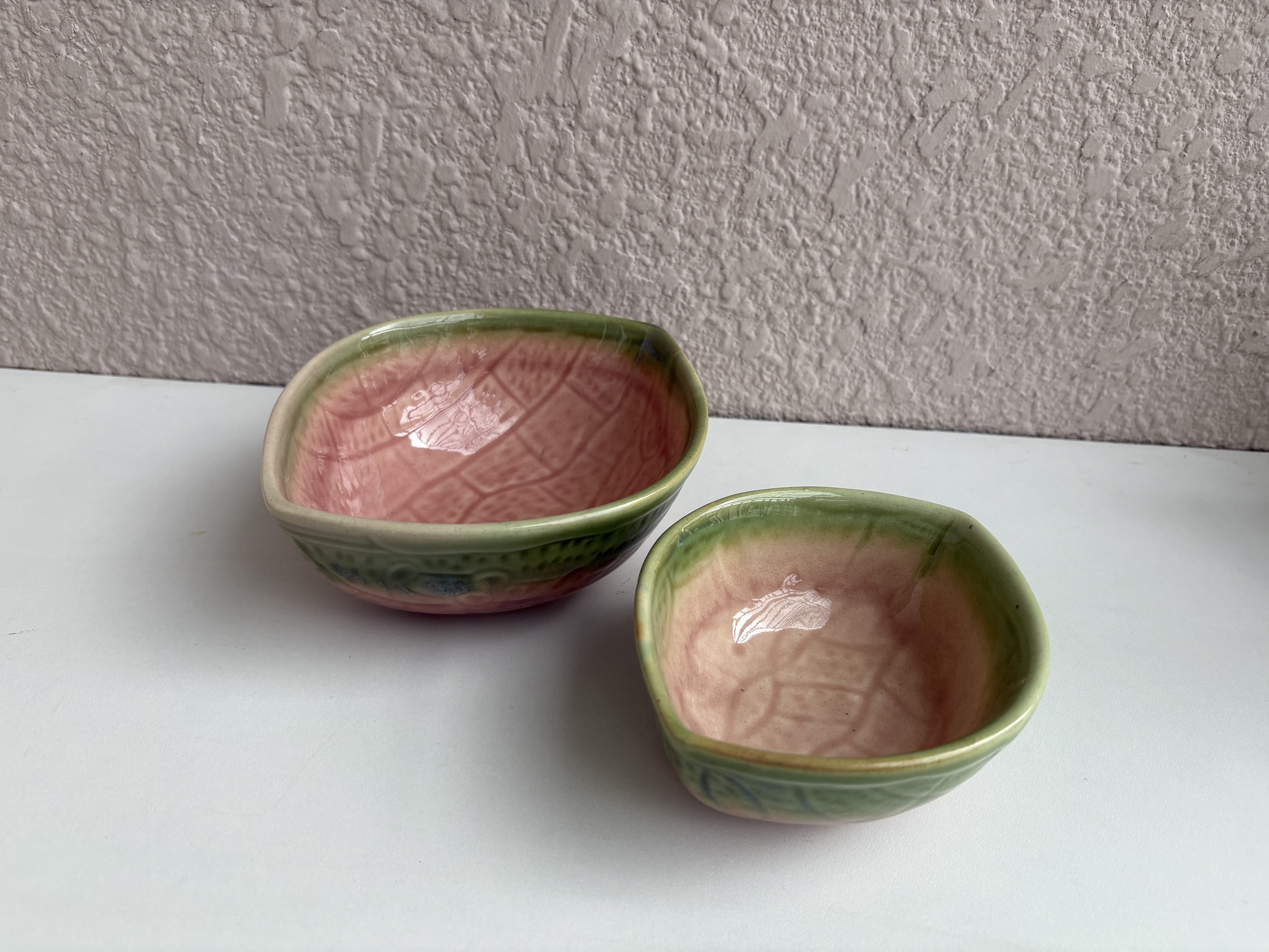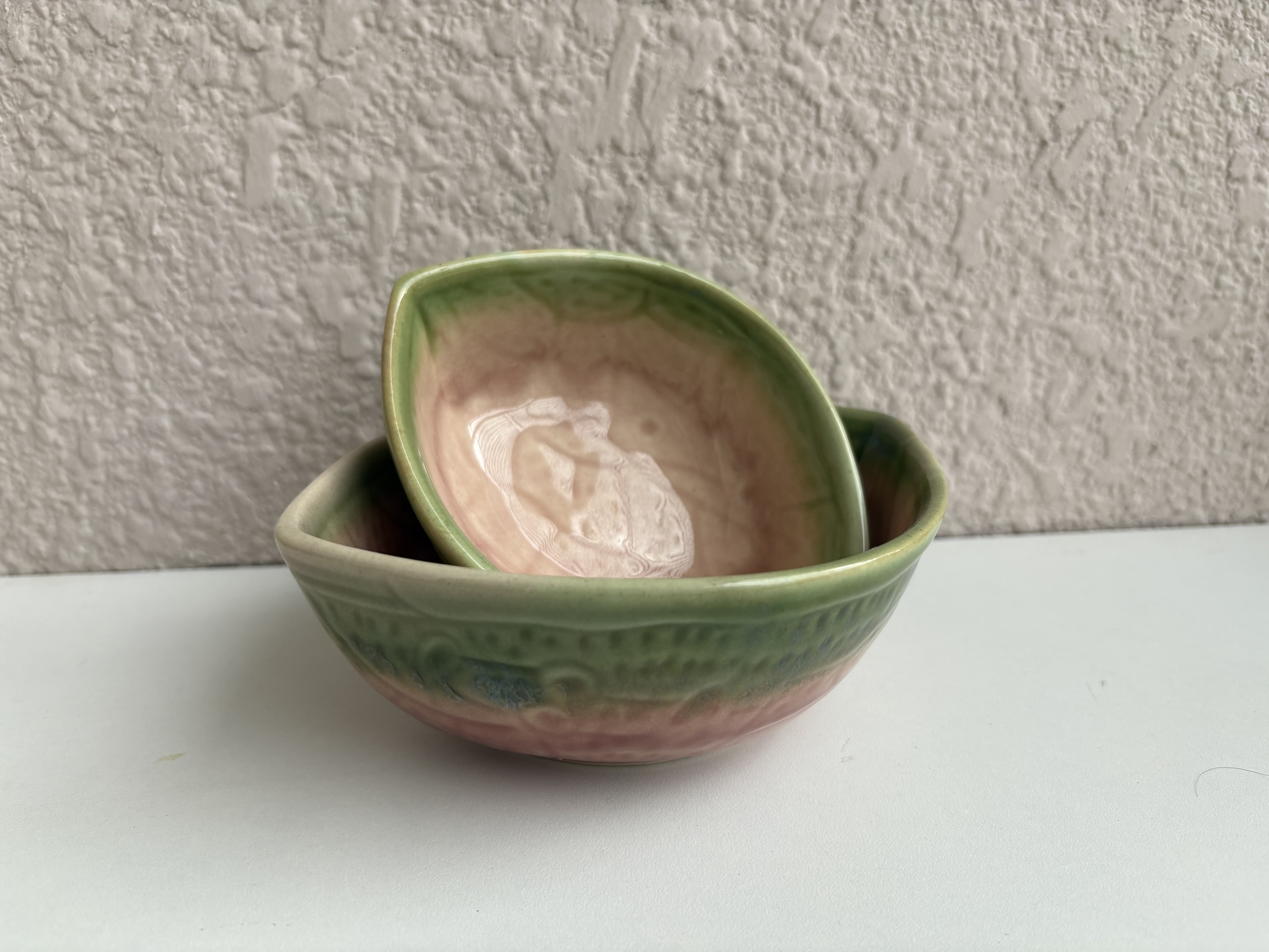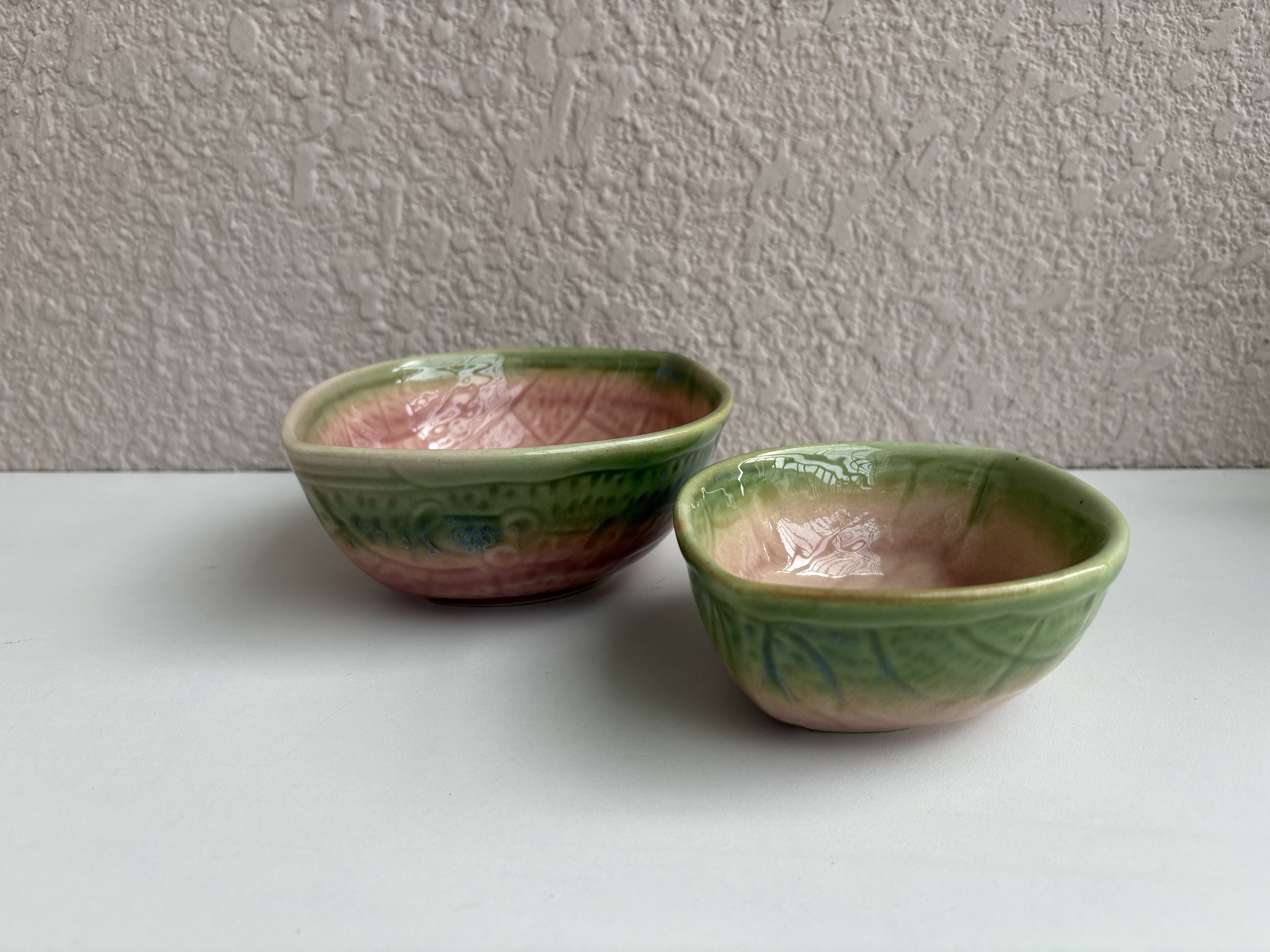 These elegant, almond-shaped ceramic bowls feature a stunning two-tone glaze of soft pink interiors with verdant green rims and textured exterior detailing. Each set contains two complementary sizes (6″ and 4.5″ length) perfect for serving dips, condiments, small salads, or decorative use. The handcrafted design showcases delicate leaf impressions around the exterior, creating a beautiful tactile element that enhances their natural almond silhouette.