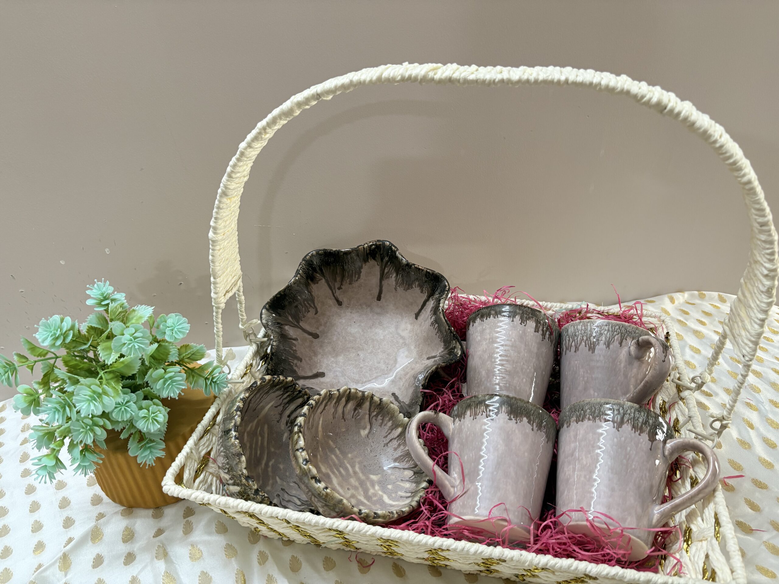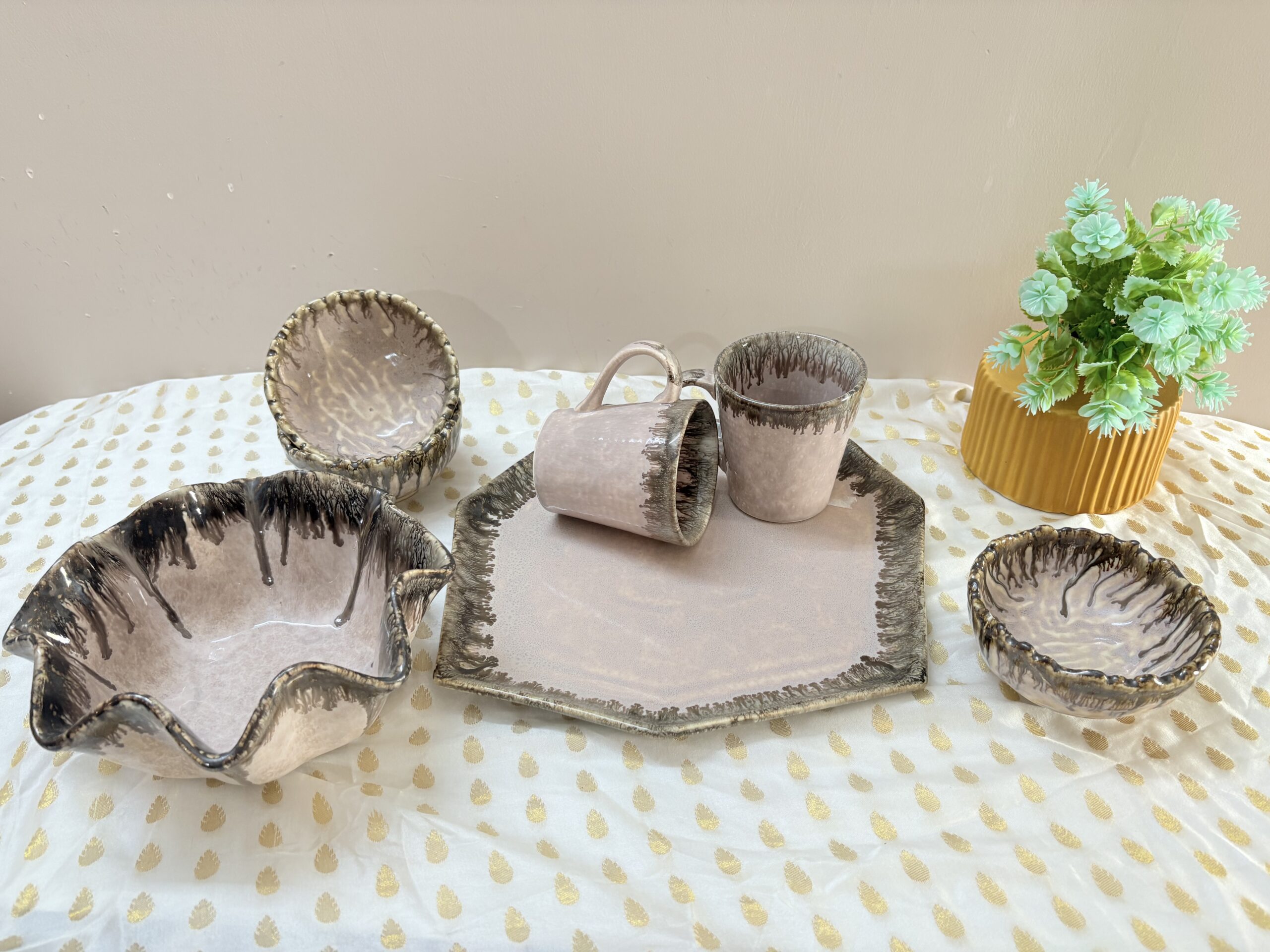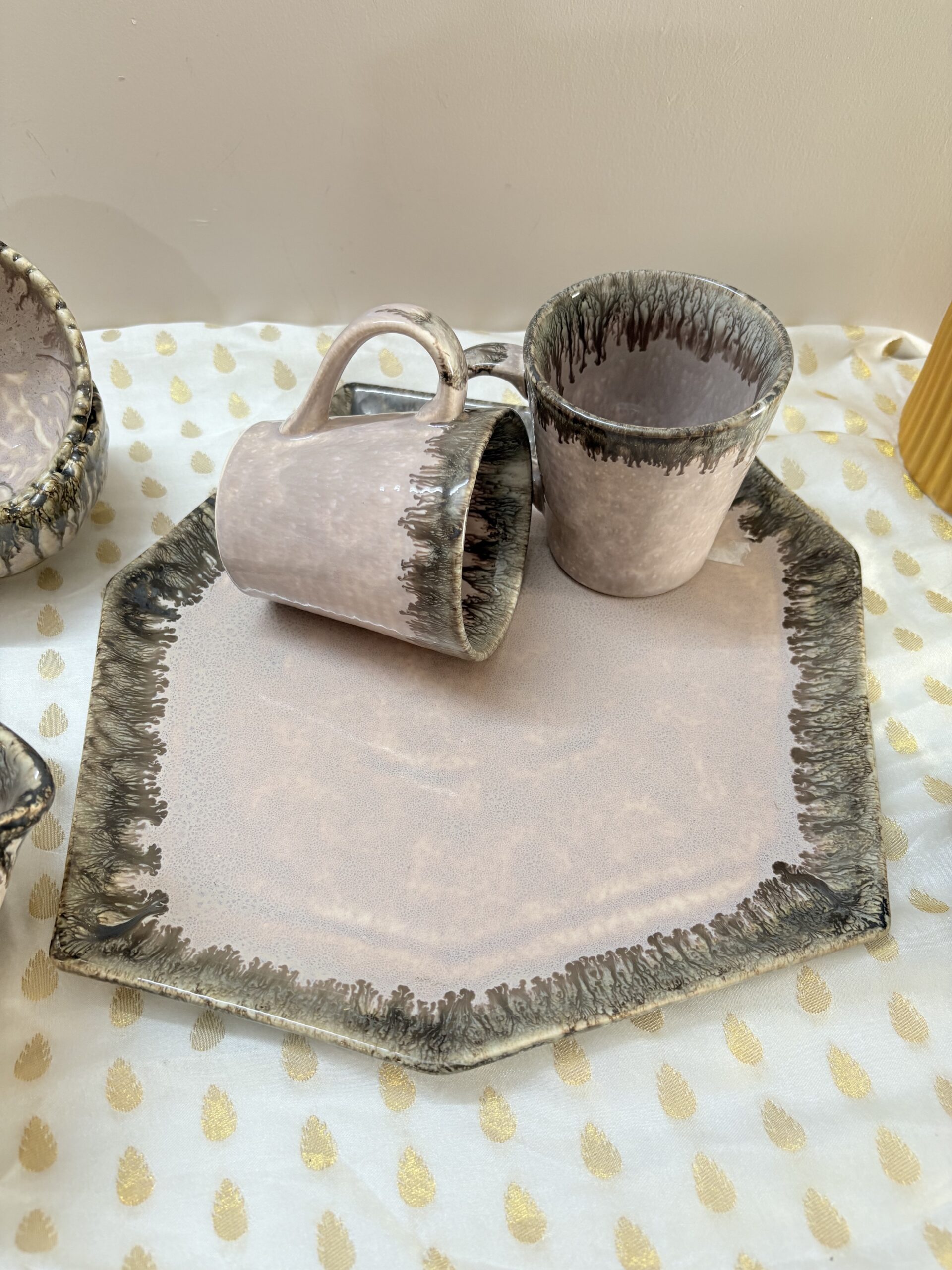 Add a touch of artisan charm to your dining table with this handcrafted 13-inch pentagon ceramic platter. Designed with a soft pastel glaze and unique dark-edged detailing, it’s perfect for serving appetizers, desserts, or as a statement decor piece.