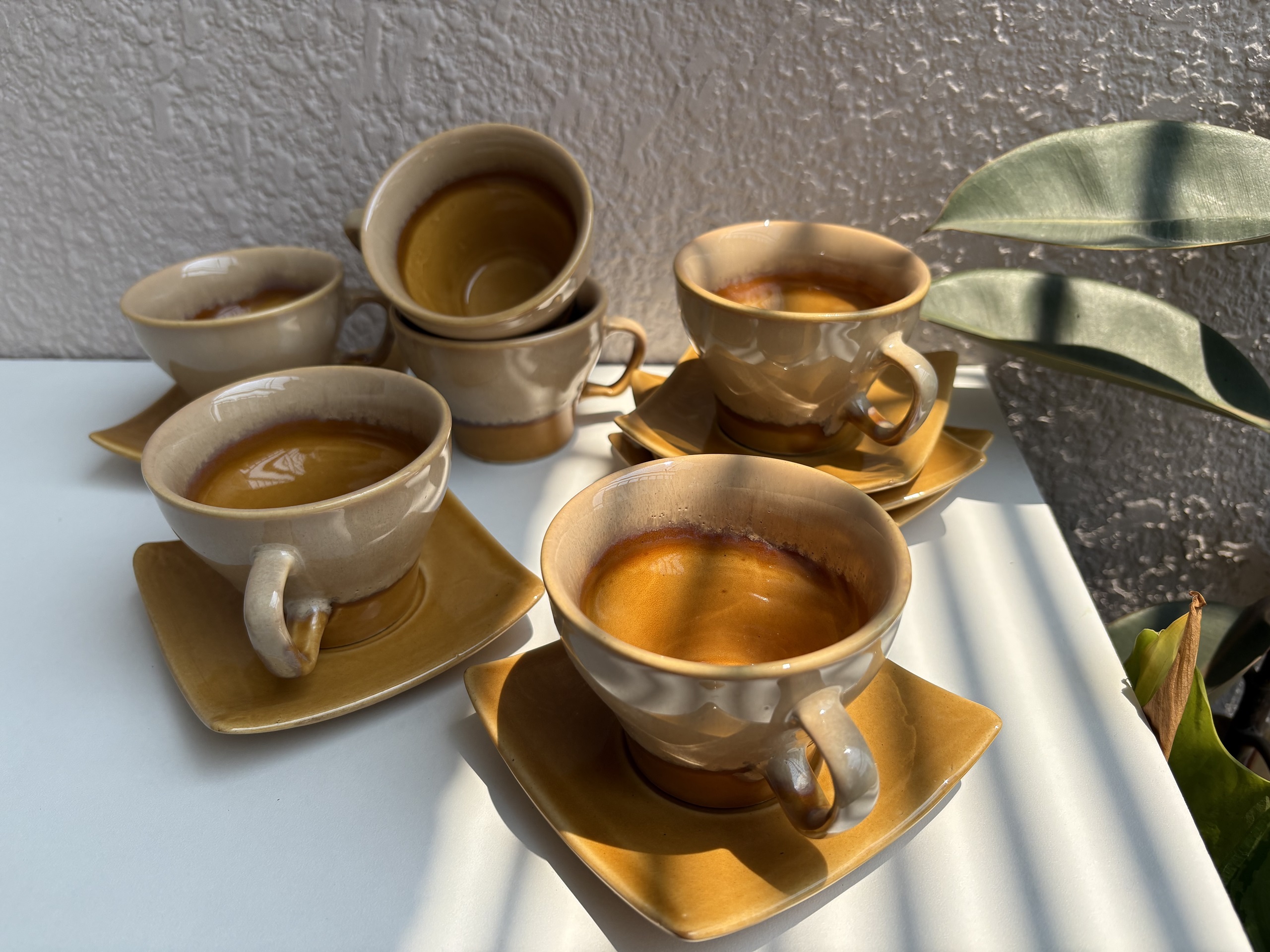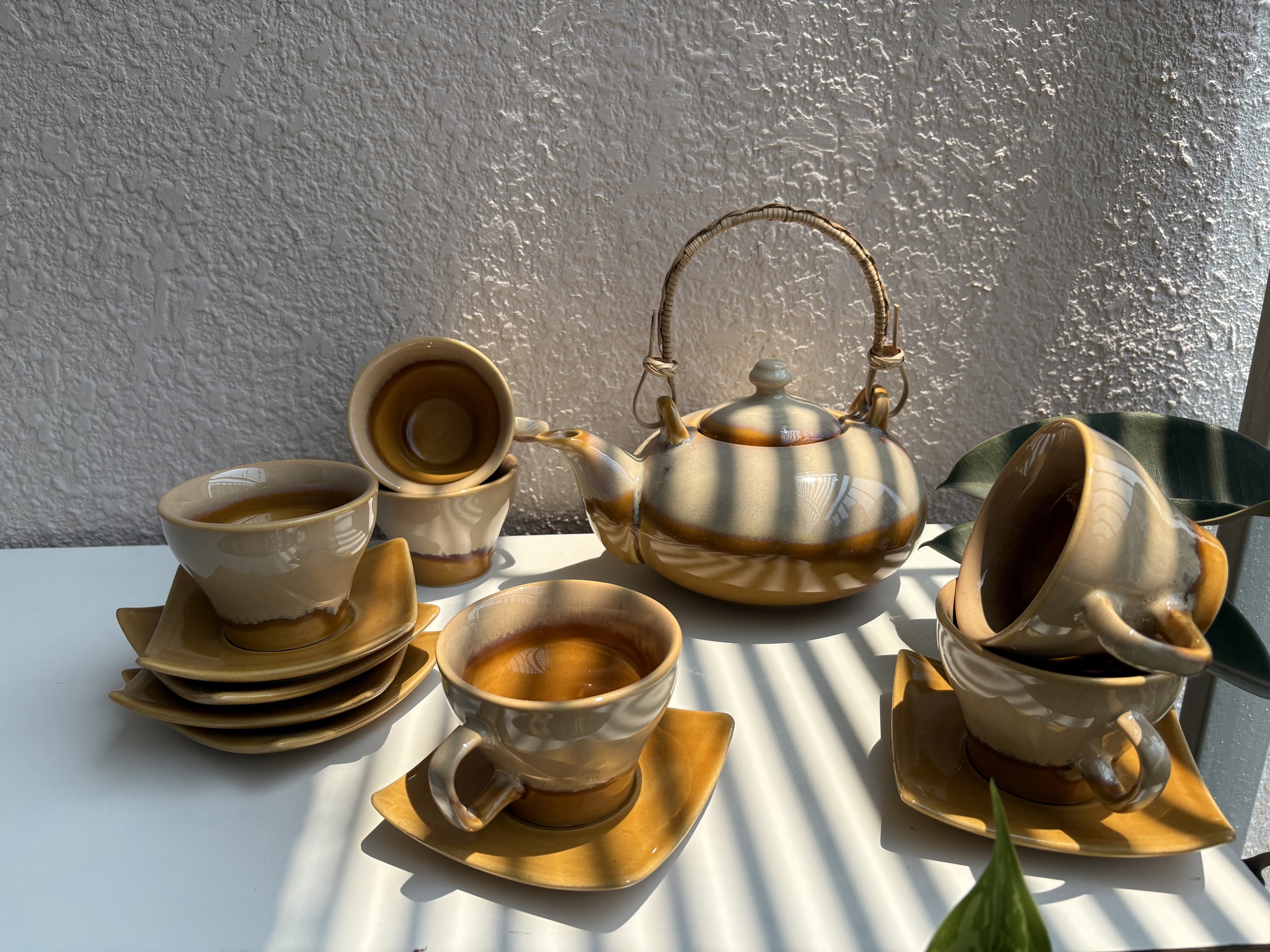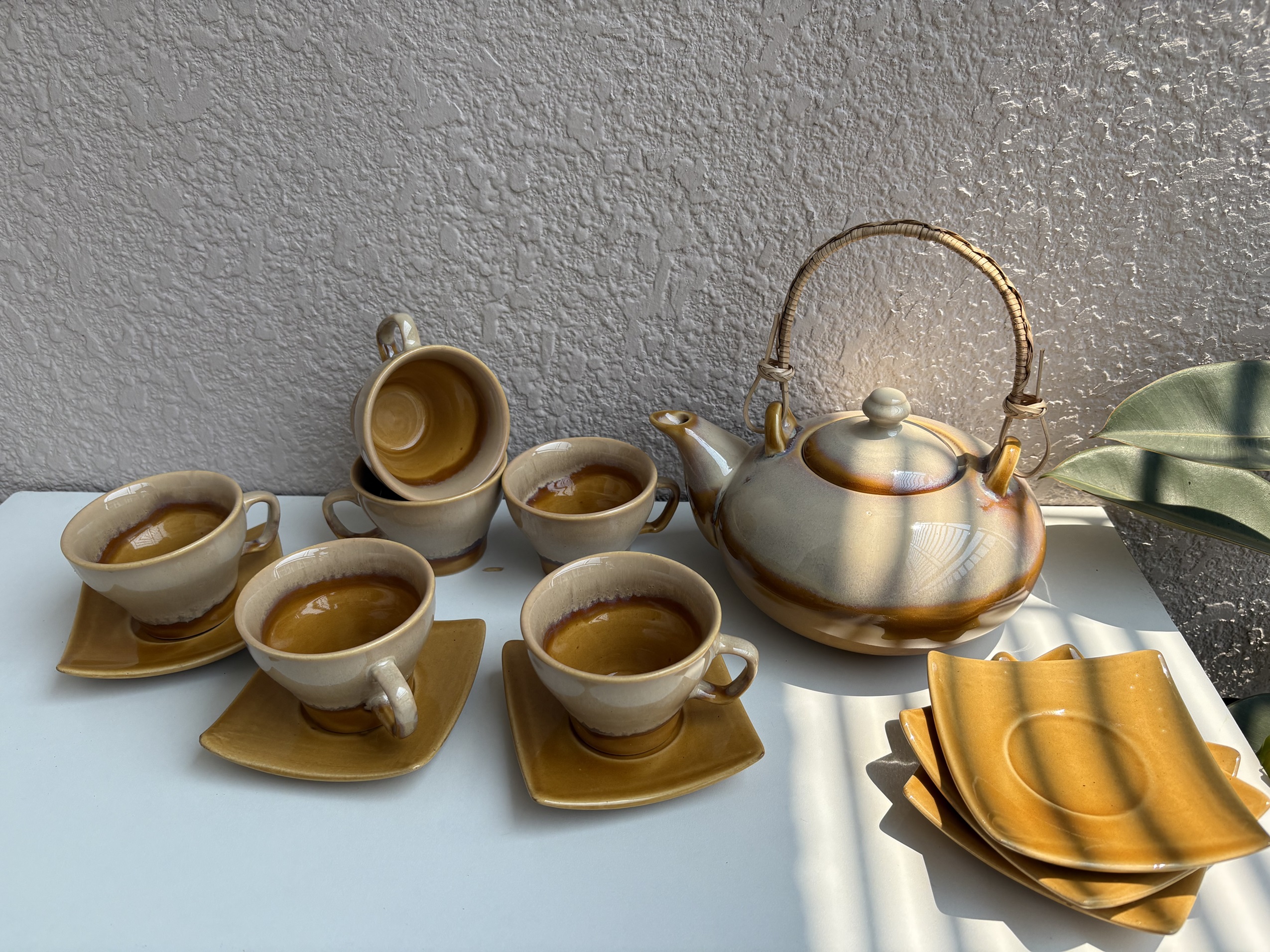 Elegant caramel-toned tea set including 1 designer kettle with handle and 6 matching cup-saucer pairs — perfect for stylish tea times.