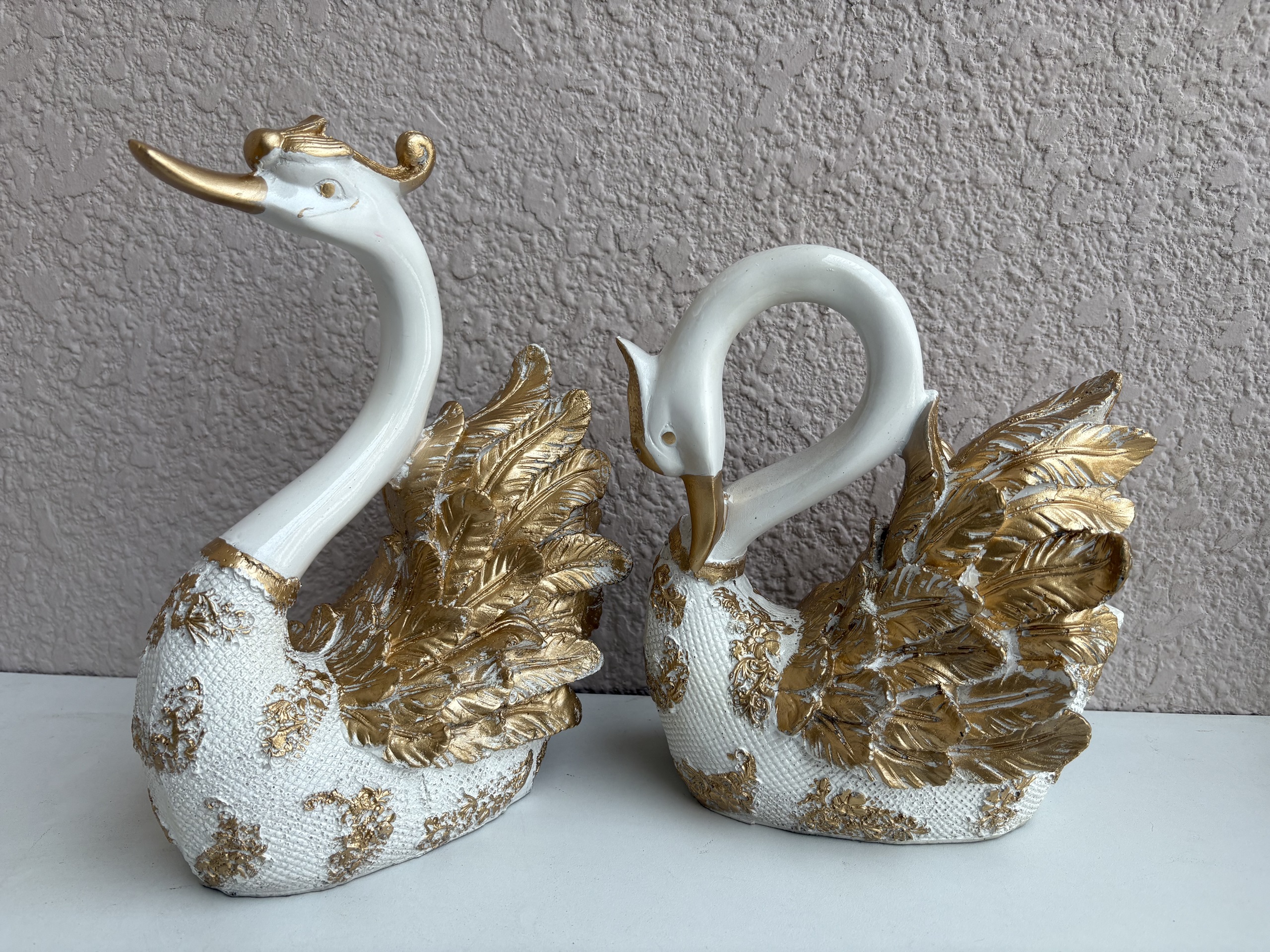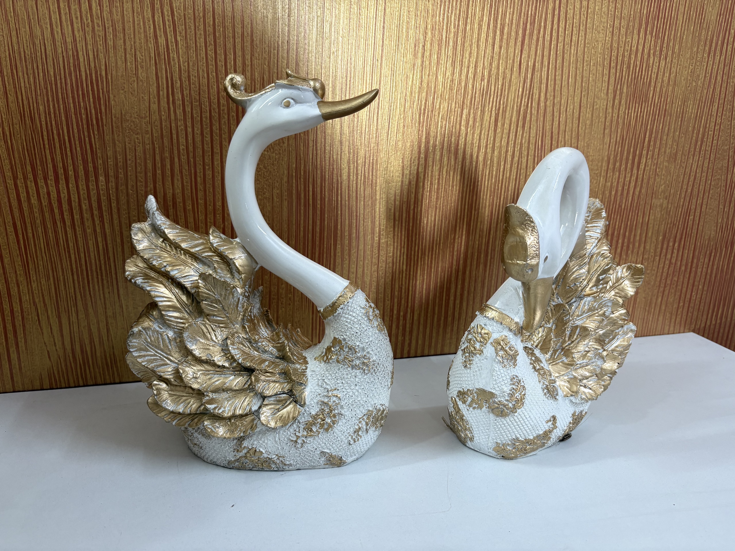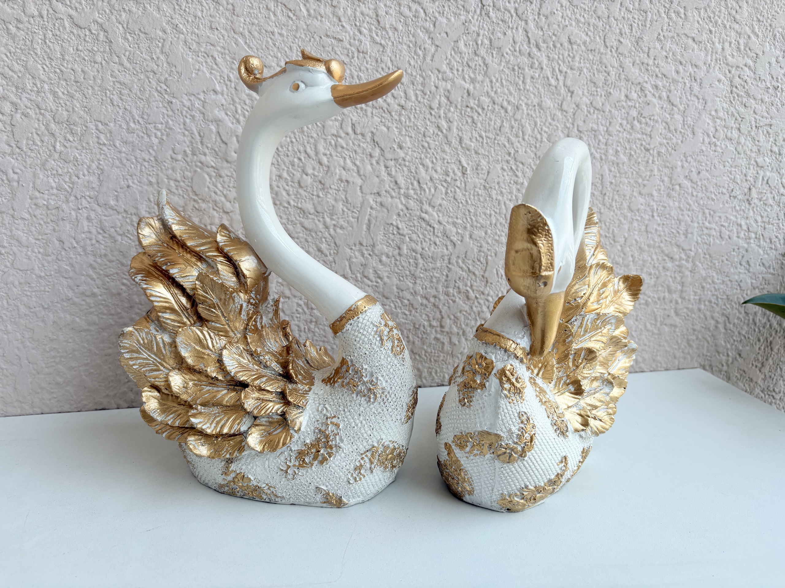 Transform your home décor with our exclusive “Beautiful Swan Dio” sculpture. This breathtaking piece showcases two pristine white swans, their necks gracefully curved and their magnificent golden wings catching the light with a subtle shimmer. Crafted from high-quality polyrasin, each feather and contour is rendered with extraordinary precision, creating a lifelike representation that embodies elegance and refined taste. Whether displayed in your living room, bedroom, or office, the “Beautiful Swan Dio” brings an air of tranquility and sophistication to your space.