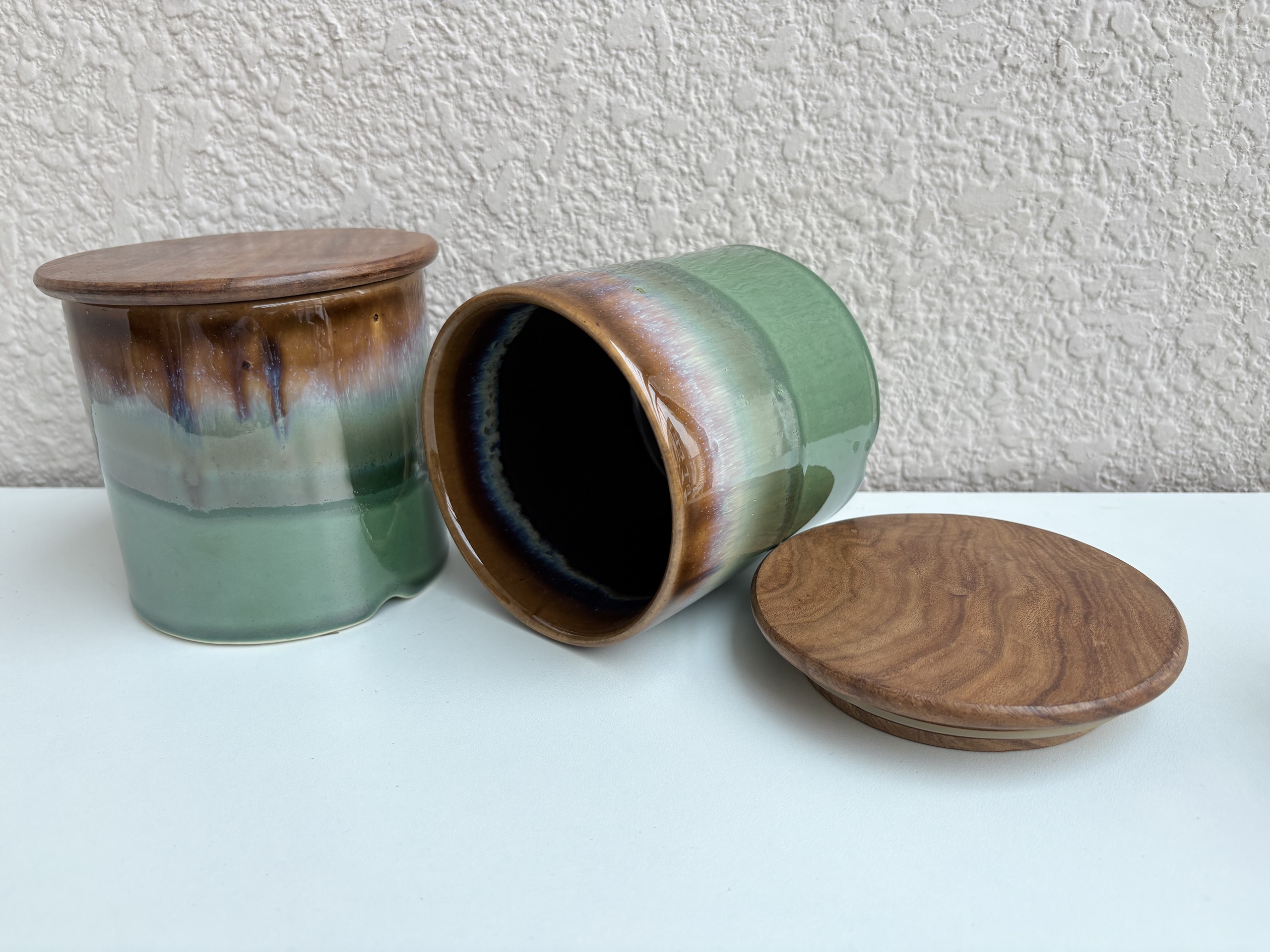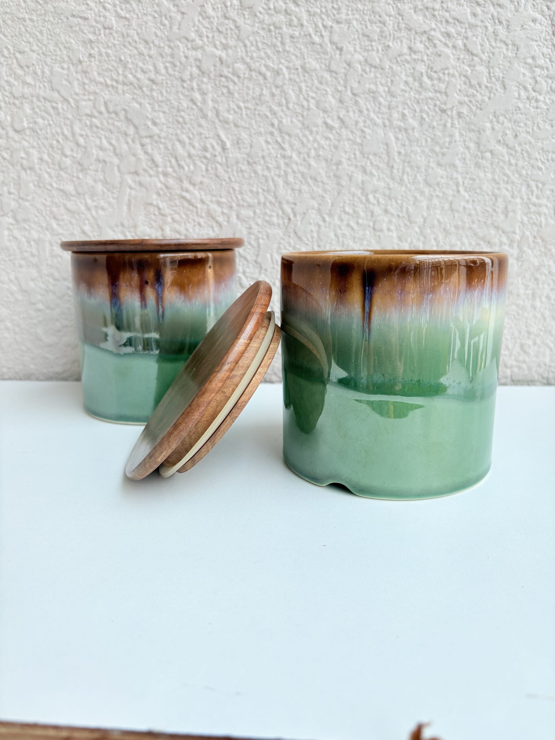 Airtight ceramic jar in a rich emerald glaze, paired with a natural wooden lid to keep contents fresh. Ideal for kitchen storage or elegant countertop decor.