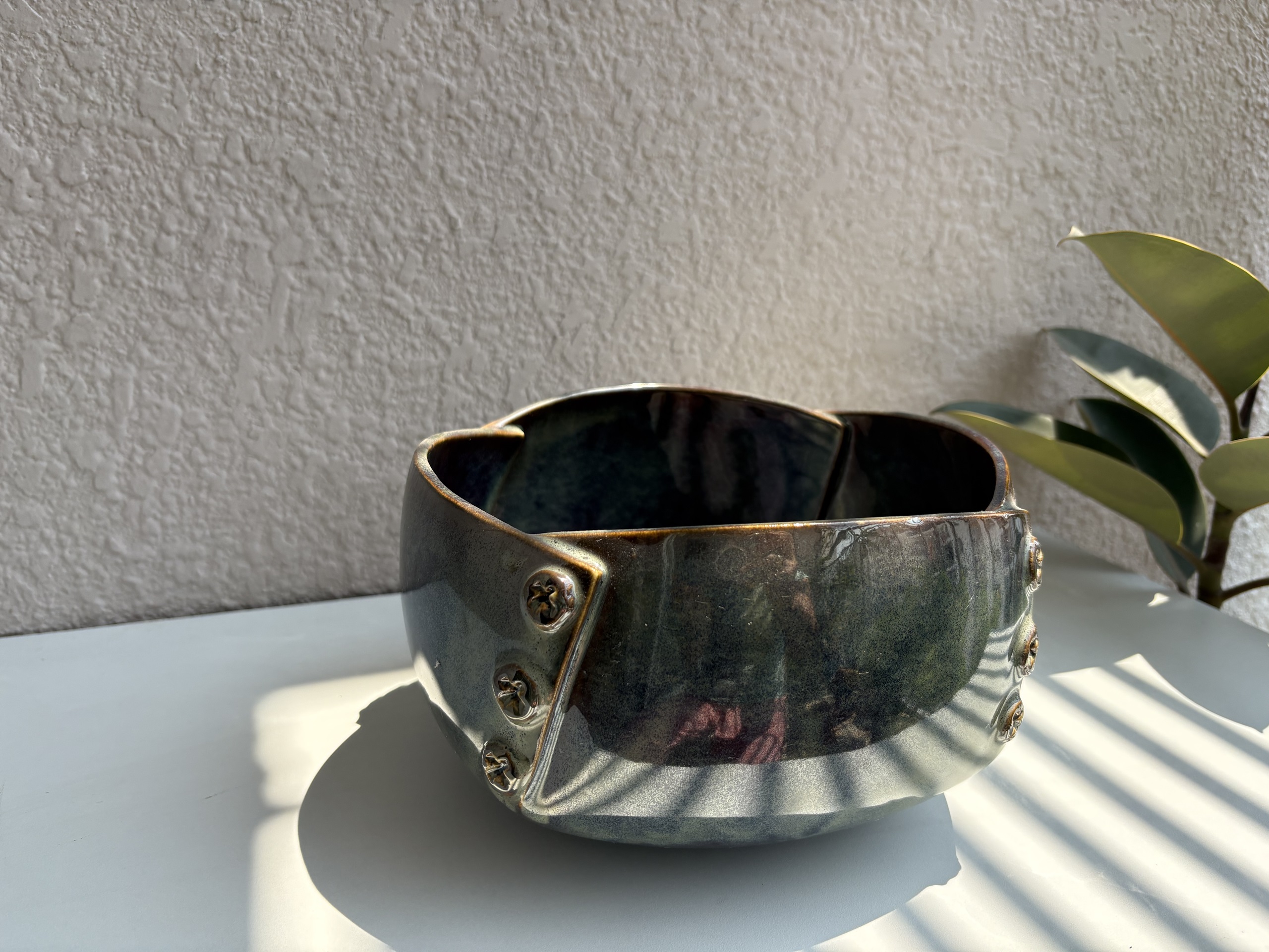 Elevate your dining or decor setup with this 8-inch large deep ceramic bowl in an enchanting forest green shade. Handcrafted with an artistic flair, this designer bowl features a unique stitched fold detail with button accents, blending functionality with a statement aesthetic. Its deep, spacious design makes it perfect for serving or as a centerpiece.