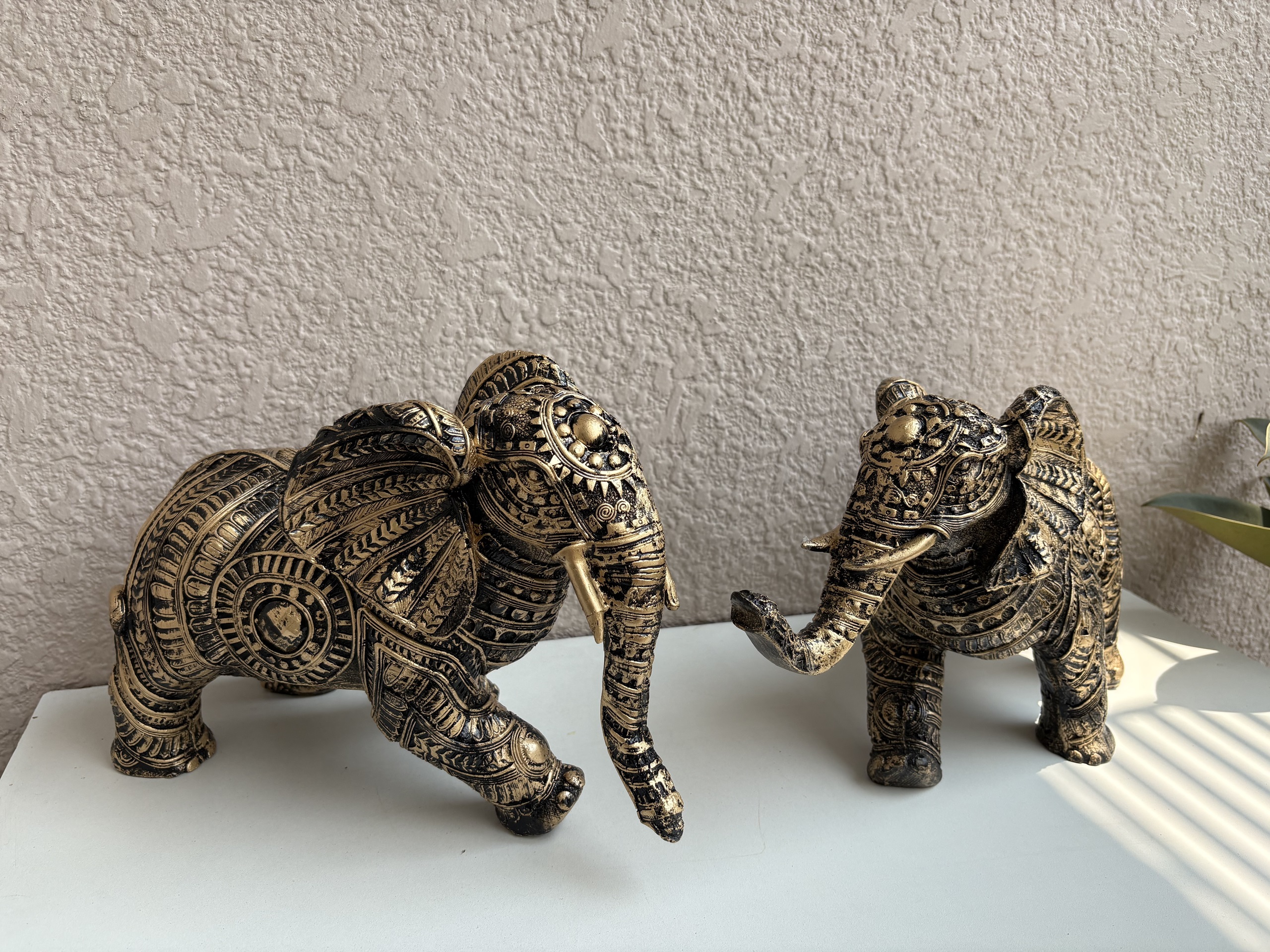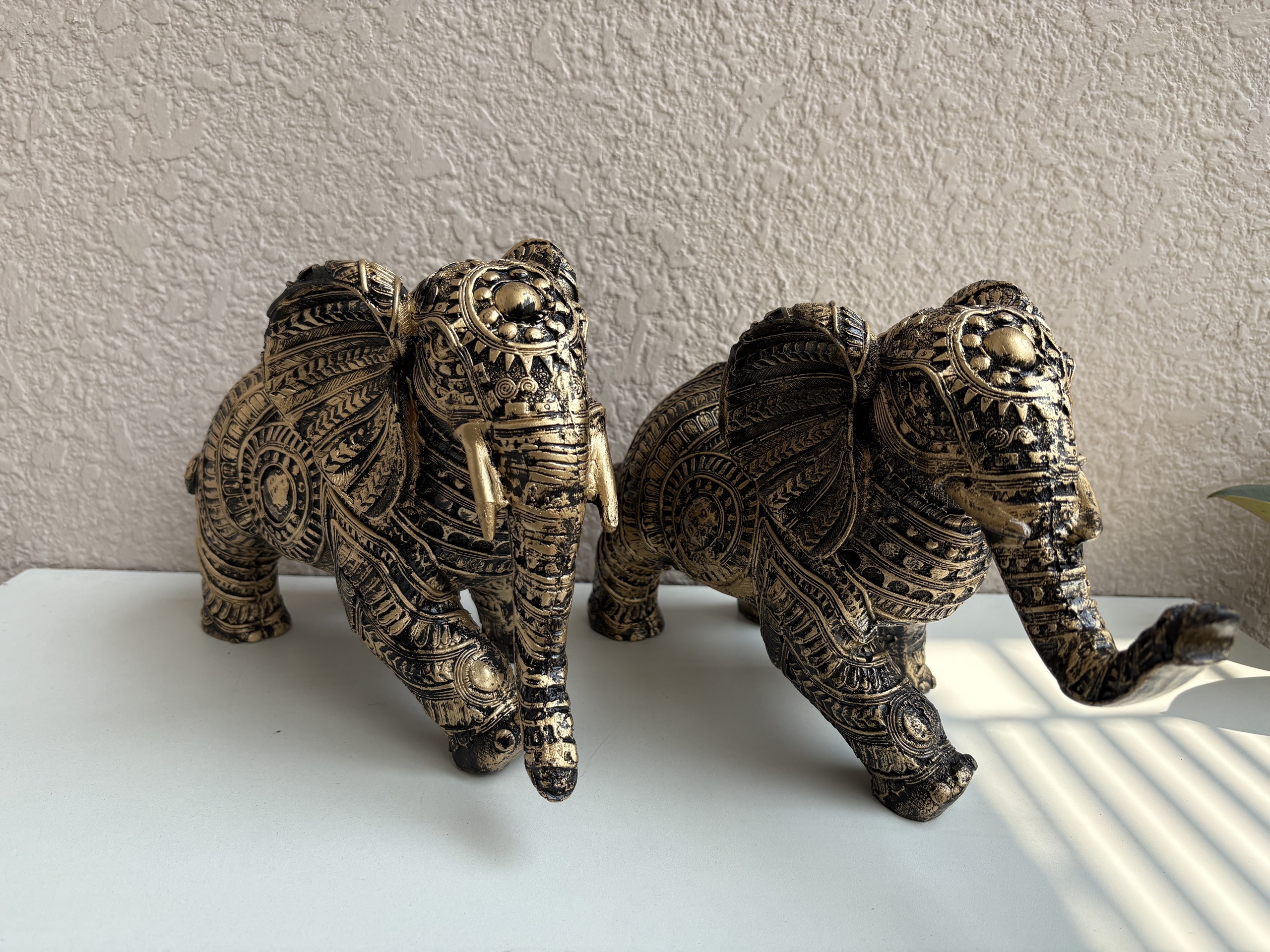The elephants are positioned in complementary walking stances, creating a visual harmony that symbolizes progress, prosperity, and the journey through life. In many cultures, elephants represent wisdom, good fortune, and protection—making this pair not just a decorative element but a meaningful addition to your home that radiates positive energy.