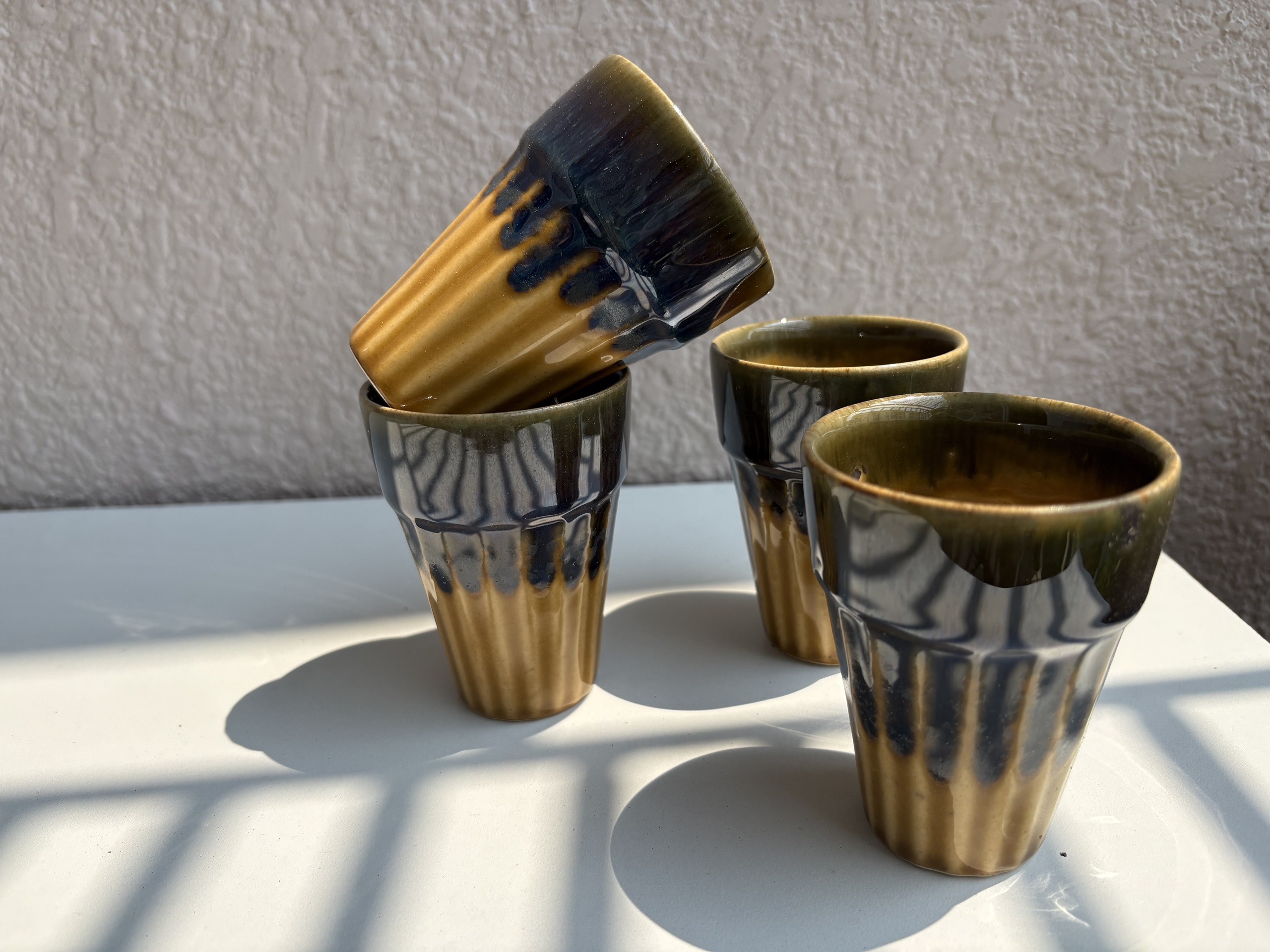 Product Description: Handcrafted Ceramic Kulhads. Elegant two-tone glazed chalices are perfect for serving beverages or desserts. Each piece features our signature gold-to-navy reactive glaze, creating a one-of-a-kind appearance—studio-made from durable stoneware with a food-safe finish.