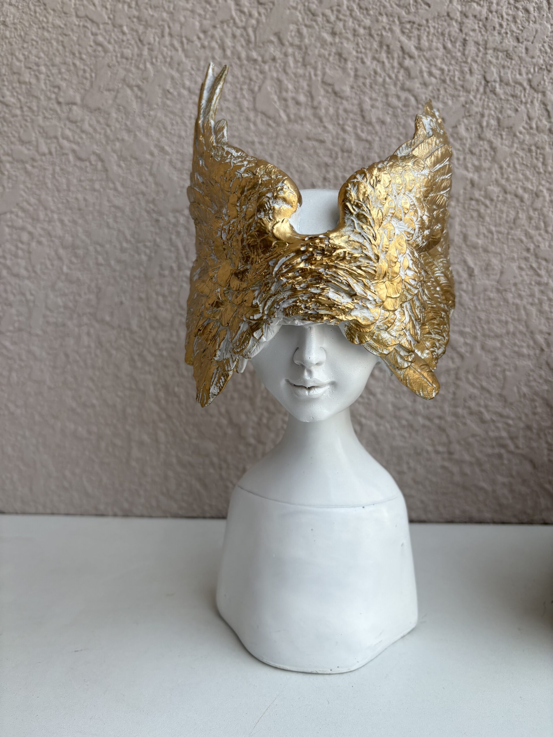Add a divine touch to your decor with Majestic Golden Wing Grace—a 12″ tall handcrafted resin/polyrasin statue featuring a serene feminine form crowned with sweeping golden wings. This artistic piece blends elegance and strength, making it a captivating centerpiece for modern interiors, shelves, or gift collections.