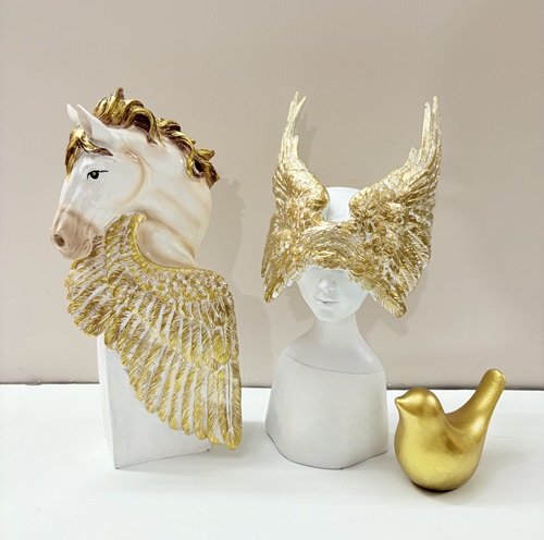 Add a divine touch to your decor with Majestic Golden Wing Horse—a 12″ tall handcrafted resin/polyresin statue featuring a serene feminine form crowned with sweeping golden wings. This artistic piece blends elegance and strength, making it a captivating centerpiece for modern interiors, shelves, or gift collections.