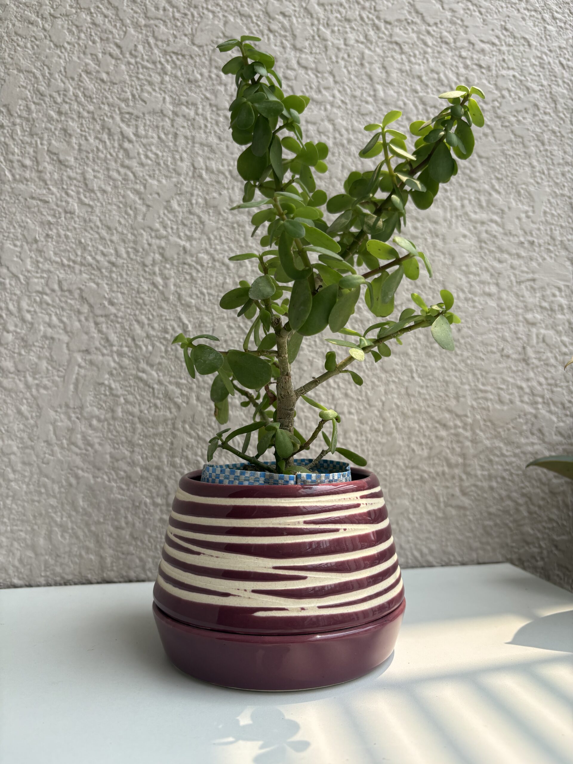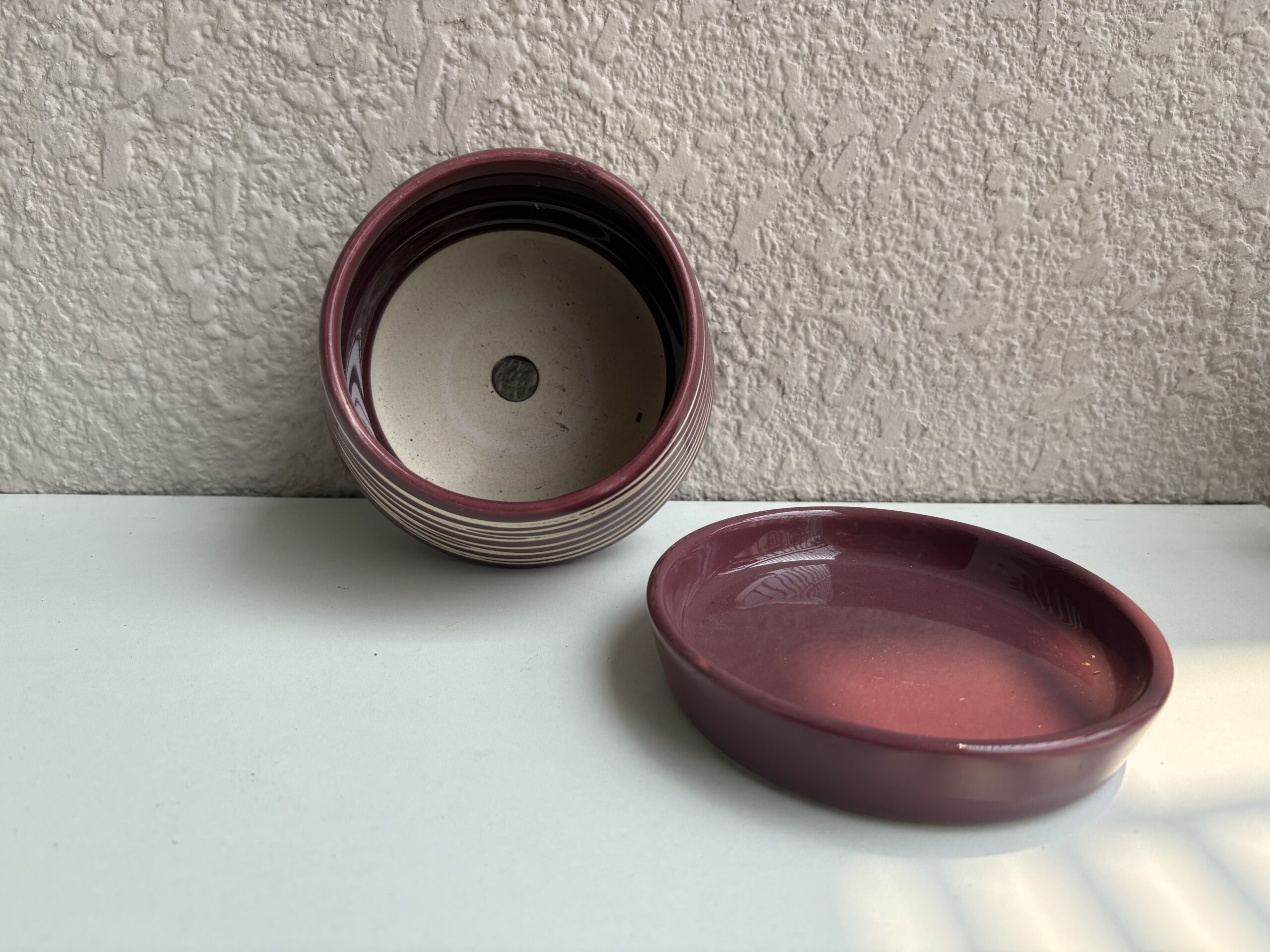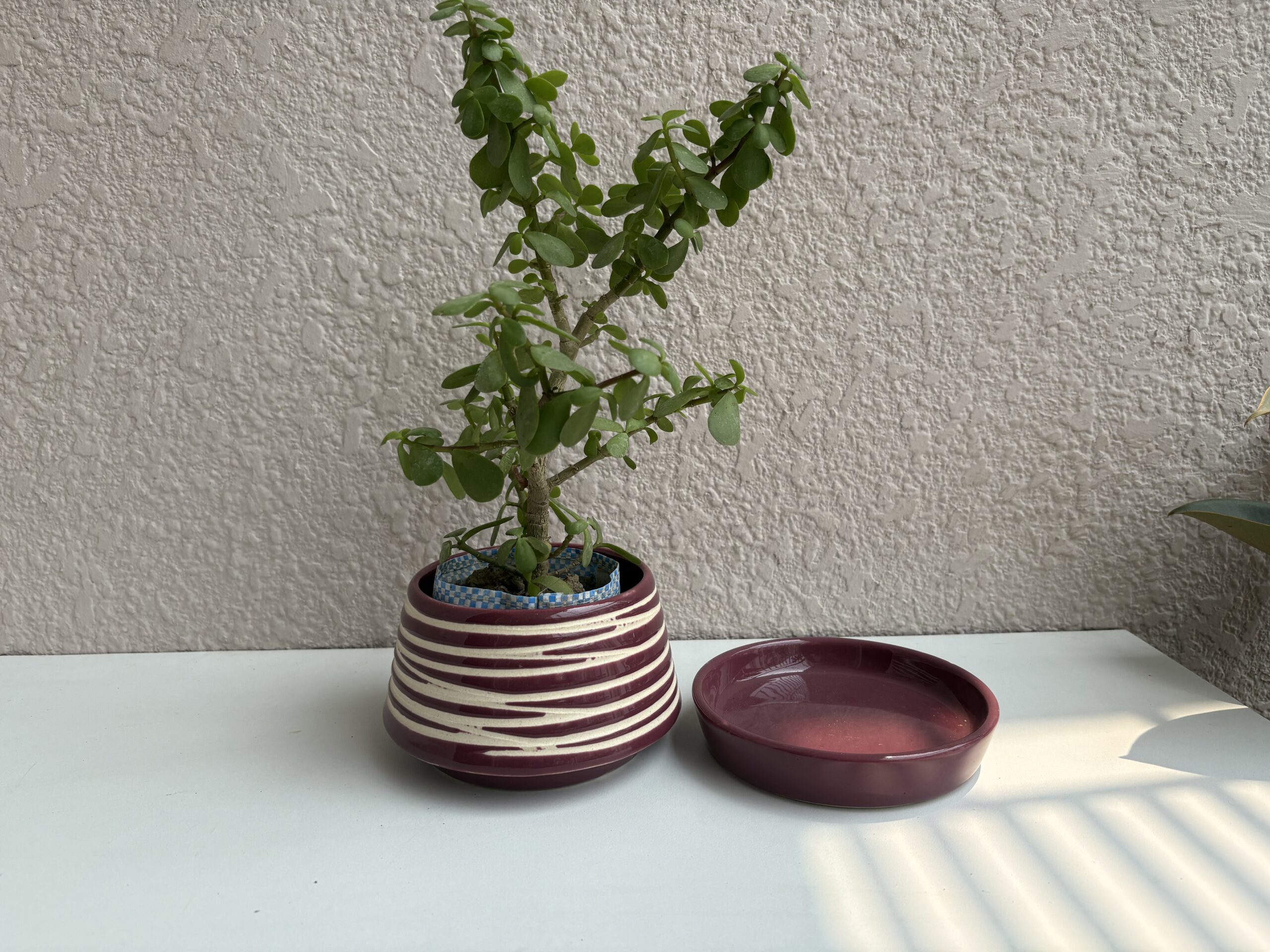 A handcrafted 4.5″ ceramic planter featuring a striking ribbed stripe design. Finished in a dual-tone cherry studio glaze, this pot comes with a matching drainage plate — perfect for succulents, herbs, or indoor greens. Adds a touch of artisanal charm to any space.